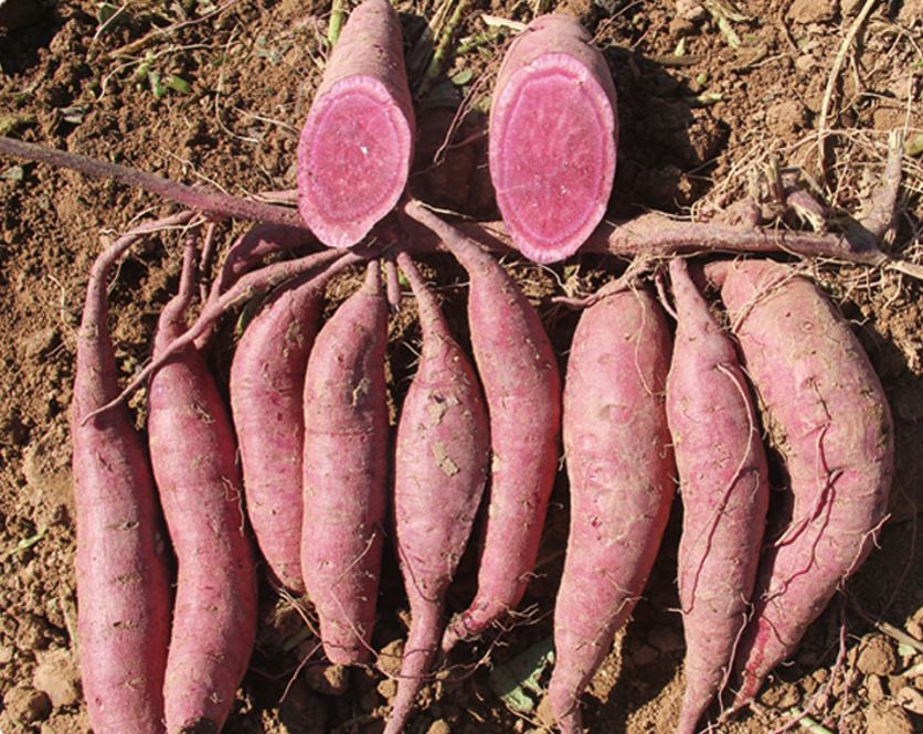 鮮食型甘薯品種,中長(zhǎng)薯,數(shù)塊條形,薯皮紫紅色,薯肉紫色,結(jié)薯集中整齊,干物率33.44%,鮮薯花青素含量為20.46mg/100g。抗甘薯蔓割病、根腐病、黑斑病,耐儲(chǔ)存性好。一般畝產(chǎn)鮮薯2000公斤左右。